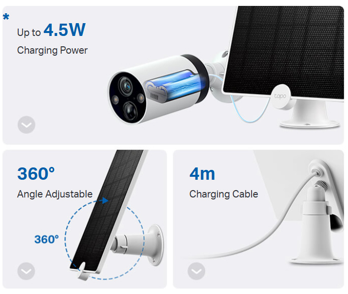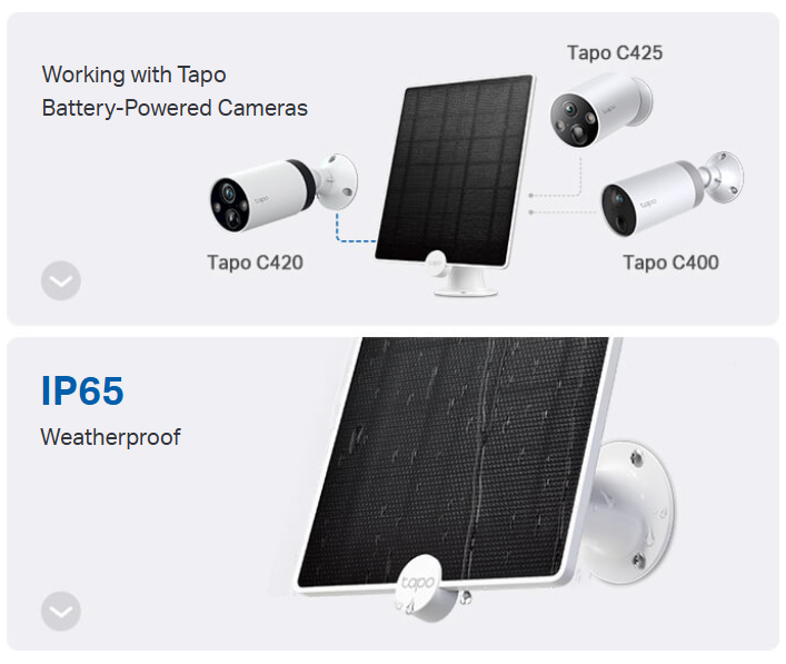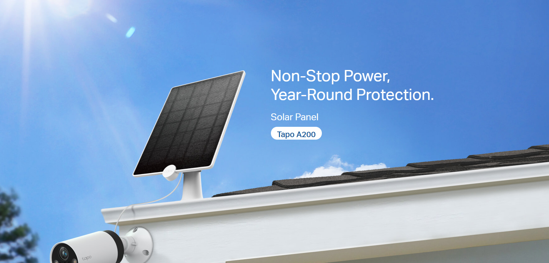 - Nguồn năng lượng mặt trời liên tục - Thu thập năng lượng mặt trời miễn phí, sạch và cung cấp nguồn điện liên tục cho camera chạy bằng pin Tapo của bạn (Tapo C400 v1.0, Tapo C420 v1.0/1.20, Tapo C425 v1.0/1.20) để đảm bảo chúng bảo vệ bạn quanh năm.