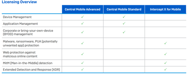Thông tin về các gói sản phẩm – Sophos Mobile