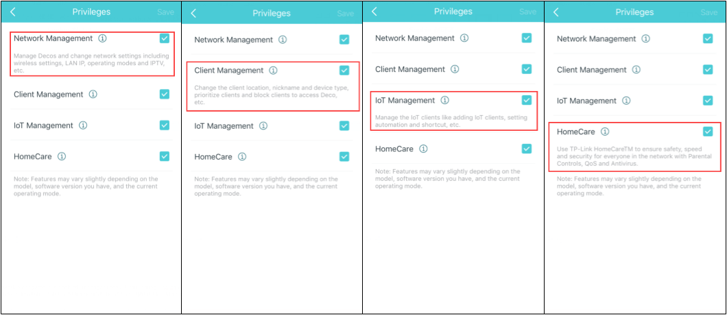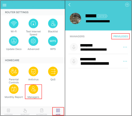 Trên Ứng dụng Deco, khi đi tới Thêm-> Người quản lý (More->Manager), bạn có thể thấy tùy chọn Đặc quyền cho tài khoản người quản lý.