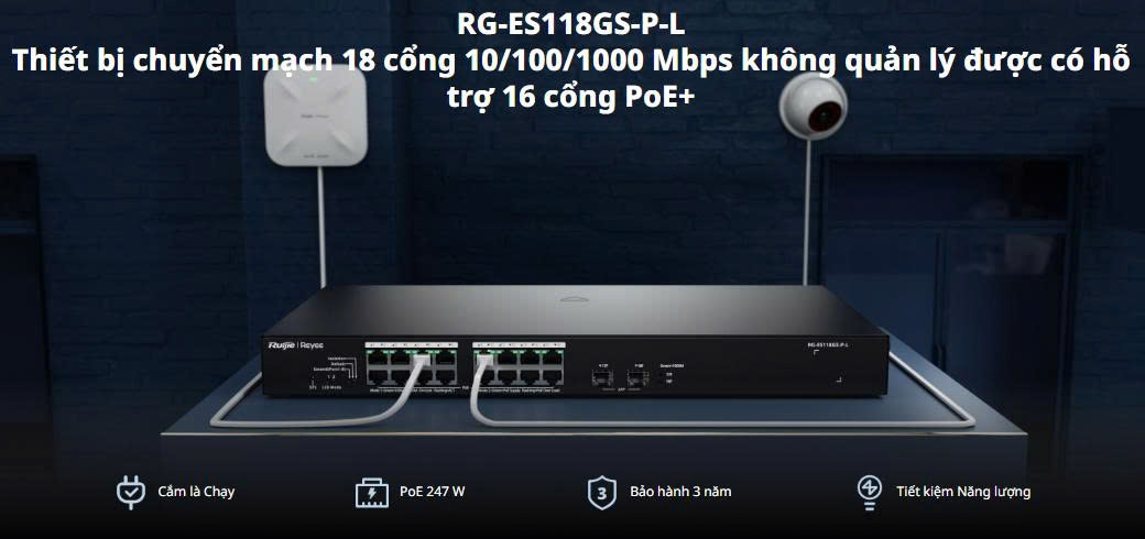 Switch PoE 16 cổng Reyee RG-ES118GS-P-L là một bộ switch 16 cổng 10/100/1000 BASE-T PoE/PoE+, tổng công suất PoE lên đến 247W và 2 cổng quang uplink 10/100/1000 Mbps BASE-X. Bên cạnh đó, Thiết bị chia mạng PoE Reyee RG-ES118GS-P-L có tốc độ chuyển mạch 36Gbps, chuyển gói tin 26.8Mpps nhằm đảm bảo hiệu suất truyền dữ liệu cao và mượt mà, đồng thời hỗ trợ nhiều chế độ tuỳ chỉnh khác nhau, quản lý địa chỉ với MAC 8K và hỗ trợ nguồn 100-240V AC.
