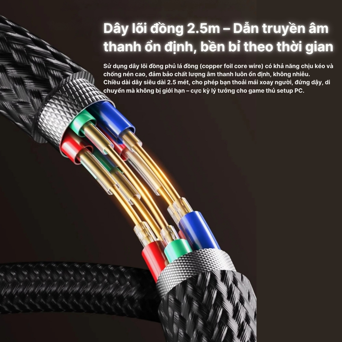 Cáp dài 2.5m làm từ đồng nguyên chất phủ foil, giúp chống nhiễu điện từ, truyền tín hiệu mượt mà và bền bỉ. Dù bạn đang stream, record hay chơi trong môi trường có nhiều thiết bị điện tử – kết nối vẫn luôn ổn định, không bị nhiễu loạn âm thanh.