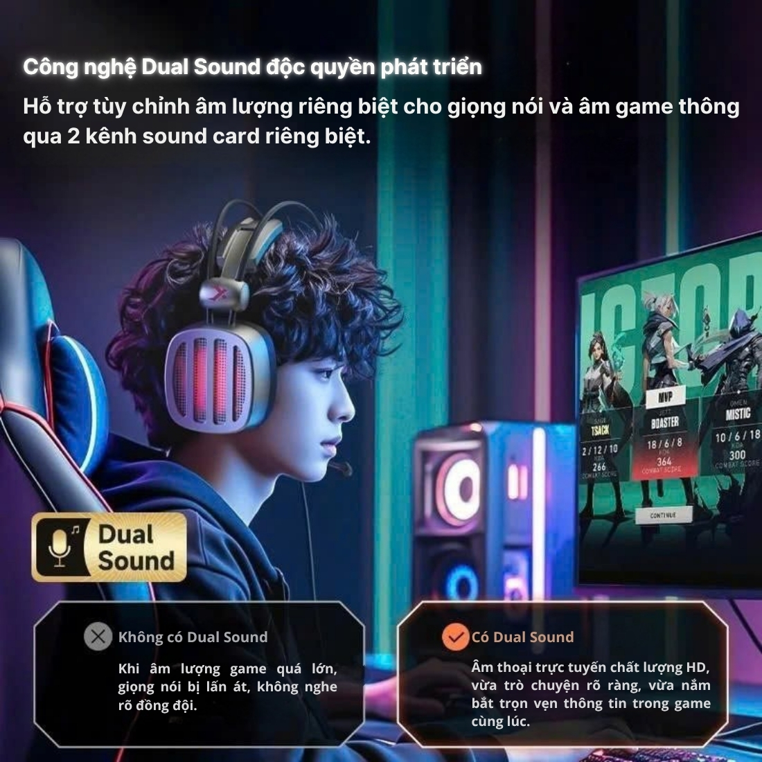 Tai nghe Xiberia S21 Max được tích hợp công nghệ Dual Sound do hãng tự phát triển, cho phép điều chỉnh âm lượng voice và game hoàn toàn độc lập nhờ hệ thống dual sound card riêng biệt. Điều này cực kỳ hữu ích khi bạn vừa cần nghe tiếng súng rõ nét, vừa phải giữ liên lạc liên tục với đồng đội.