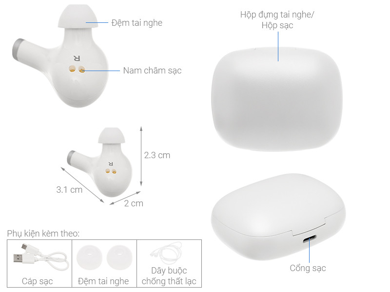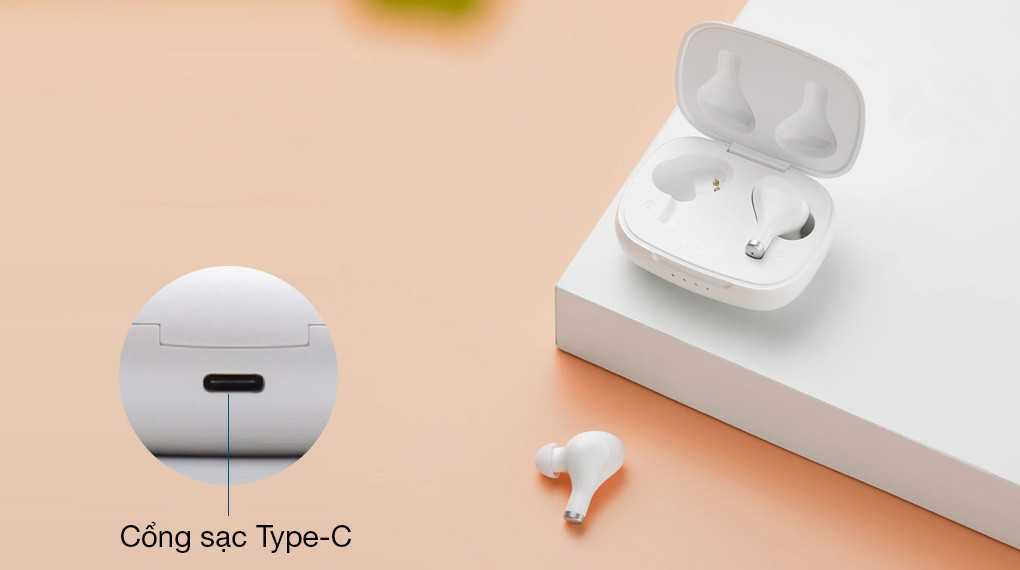 Thiết kế tai nghe True Wireless gọn đẹp, bề mặt bóng sáng với gam màu trắng trẻ trung