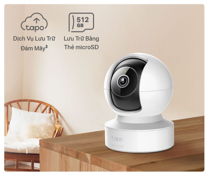 Lưu video ghi hình vào thẻ nhớ microSD† (lên đến 512 GB) hoặc sử dụng dịch vụ lưu trữ đám mây Tapo Care‡.