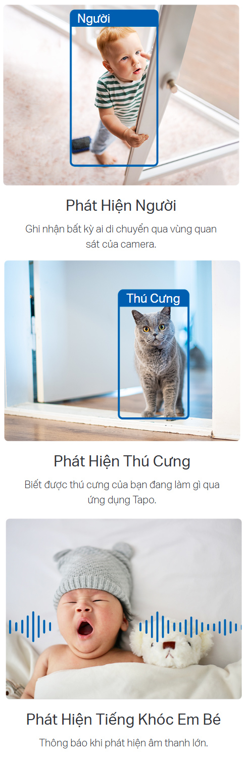 AI thông minh nhận diện người, thú cưng, xe cộ và phát hiện tiếng khóc em bé cùng các âm thanh khác để gửi thông báo kịp thời đến bạn.