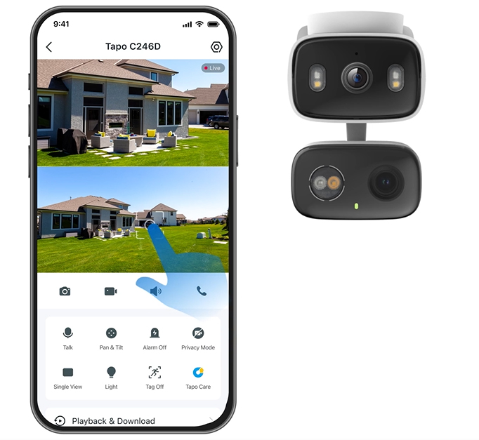 Tapo C246D có thể đặt thẳng đứng hoặc lật ngược, để kín đáo trên bàn, gắn chắc chắn lên tường, trần nhà hoặc thậm chí treo trên thanh – thiết kế linh hoạt để phù hợp và đảm bảo giám sát ổn định ở mọi không gian trong nhà lẫn ngoài trời.