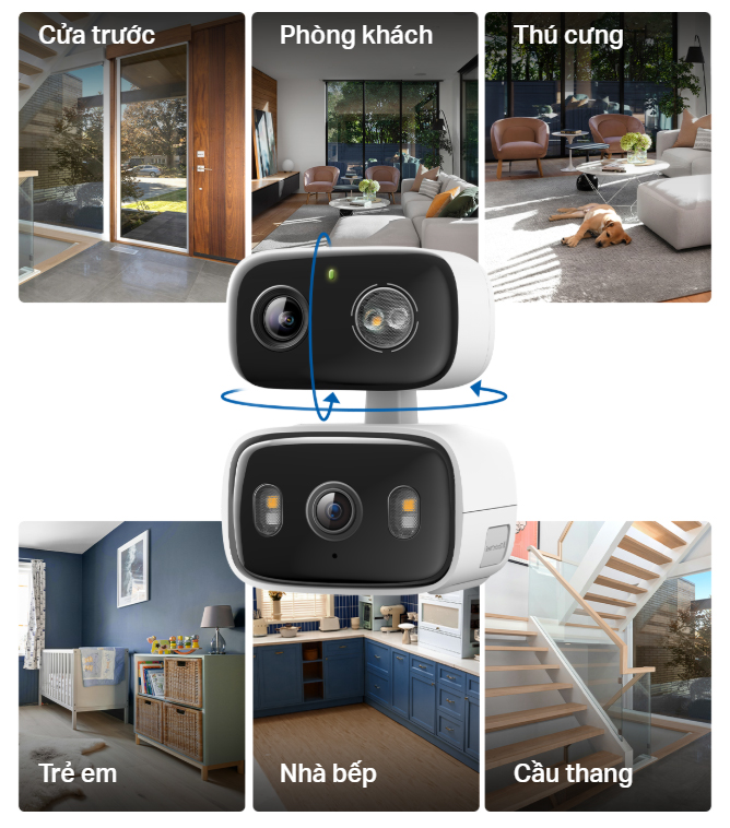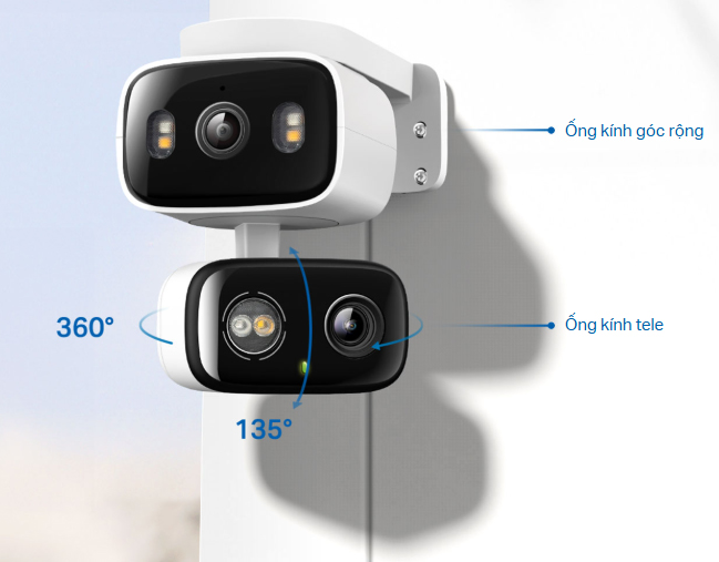 Ống kính tele phía dưới hỗ trợ xoay ngang dọc tự động để theo dõi chuyển động hoặc chuyển hướng giữa các khu vực khi cần thiết. Ống kính góc rộng phía trên là cố định nhưng có thể điều chỉnh thủ công 360° khi lắp đặt để tối ưu góc nhìn.*