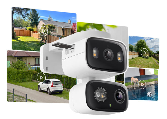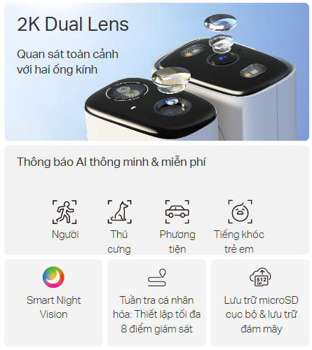 - Ống Kính Kép 2K 3MP - Ghi lại toàn cảnh với hai ống kính độ phân giải cao 2K, giúp giám sát hai khu vực riêng biệt chỉ với một thiết bị. Thiết kế nhằm giảm thiểu điểm mù để đảm bảo vùng quan sát tối ưu.