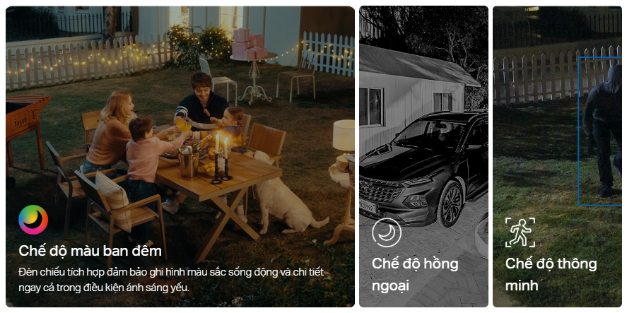 - Chế Độ Quan Sát Ban Đêm Thông Minh - Chọn chế độ toàn màu sắc với đèn chiếu, chế độ hồng ngoại đen trắng kín đáo, hoặc Chế Độ Thông Minh tự động dựa trên cảm biến ánh sáng AI để đảm bảo độ rõ nét trong mọi tình huống ban đêm.