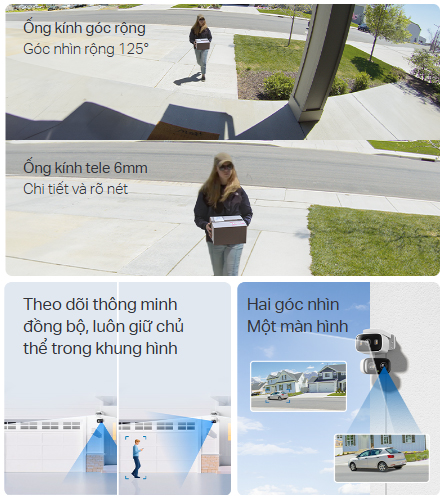 - Ống Kính Góc Rộng & Ống Kính Tele - Ống kính góc rộng 125° kết hợp với ống kính tele 6mm mang đến khả năng quan sát toàn diện và bảo vệ chi tiết ngôi nhà của bạn.