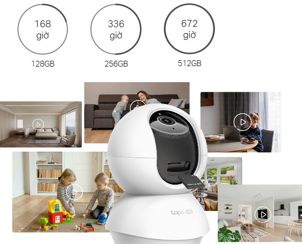 Lưu các video đã ghi trên thẻ microSD† (lên đến 512 GB) hoặc sử dụng dịch vụ lưu trữ đám mây Tapo Care‡.