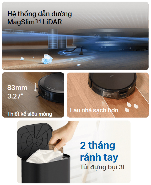 Công nghệ điều hướng MagSlim cung cấp khả năng lập bản đồ nhanh hơn với độ chính xác từng milimet, lập kế hoạch dọn dẹp hiệu quả và giảm thiểu lặp lại. Thiết kế cảm biến tích hợp giúp robot tự do di chuyển qua các không gian thấp, giảm nguy cơ bị lạc hoặc kẹt.