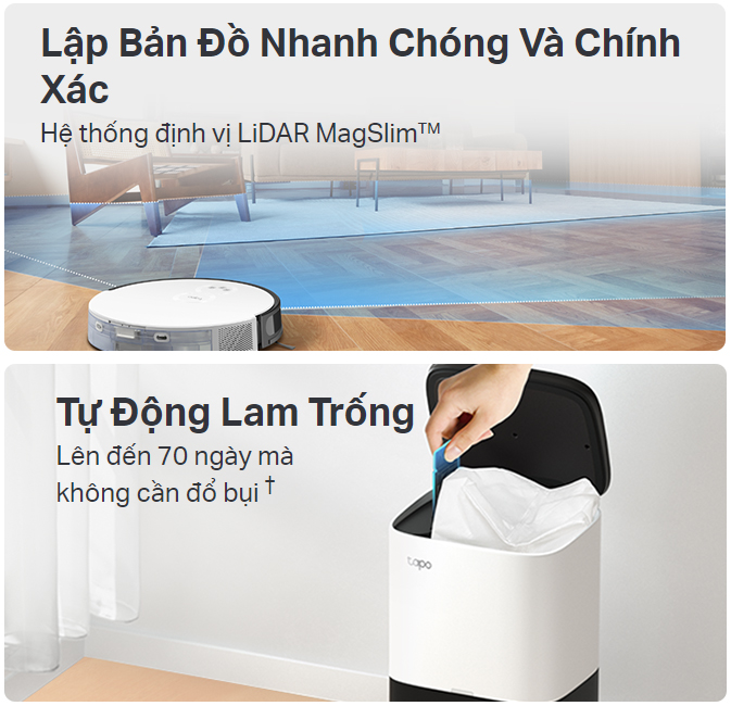† Thử nghiệm được thực hiện bởi Phòng Thí Nghiệm Tapo. Khoảng thời gian làm trống thực tế có thể thay đổi do các yếu tố sử dụng và môi trường.