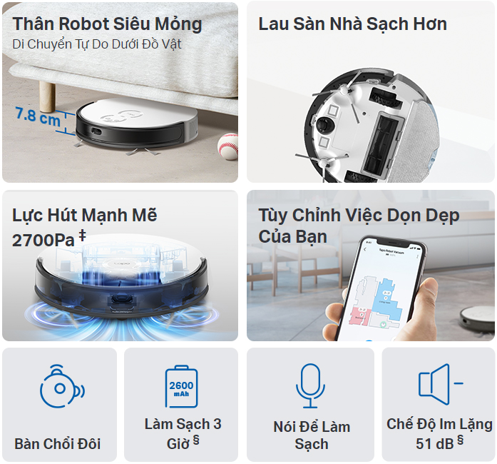 - Thiết Kế Siêu Mỏng 7.8cm: Di chuyển tự do dưới đồ nội thất để tiếp cận bụi bẩn ẩn giấu không thể thoát khỏi tầm quét của nó.