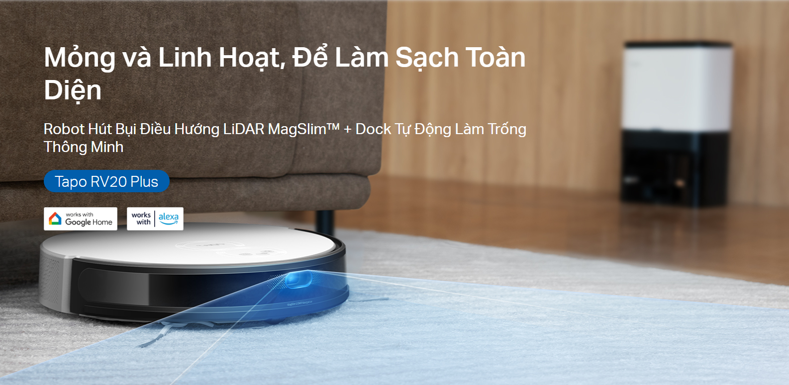 Dòng Tapo RV20 được cung cấp bởi MagSlim™ Điều hướng LiDAR, tích hợp mô-đun LiDAR vào phần trước của rô-bốt, làm cho rô-bốt mỏng hơn 0,78 inch.