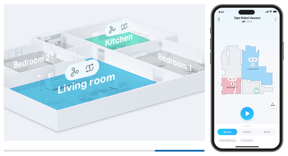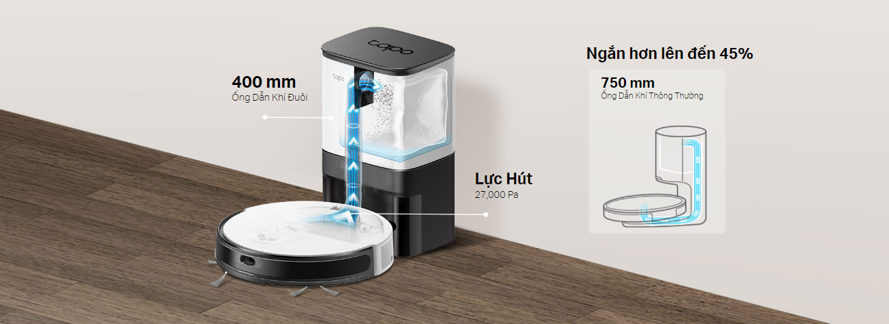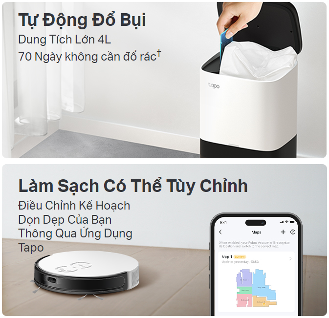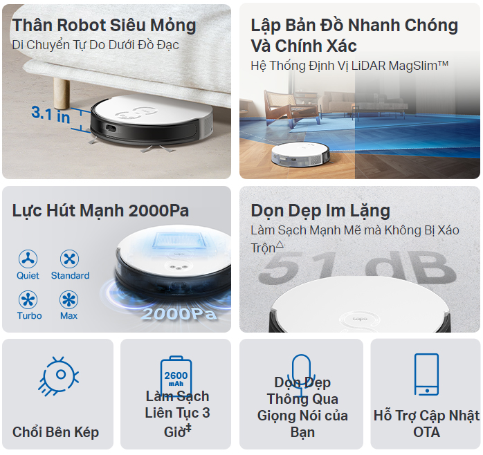 Tính năng khử tiếng ồn gấp ba lần giúp giảm mức tiếng ồn xuống còn 51dB trong khi sử dụng — yên tĩnh hơn lò vi sóng đang chạy. Tapo dọn dẹp nhà cửa mà không làm phiền bạn hoặc thú cưng của bạn.△