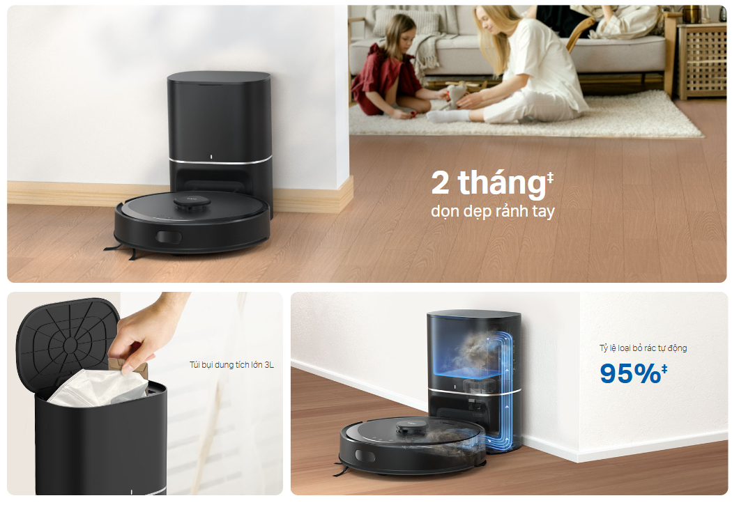 - Tự động đổ bụi với túi đựng bụi lớn 3L - Giữ nhà cửa luôn sạch bụi trong vòng 2 tháng với túi đựng bụi lớn 3L dùng một lần.