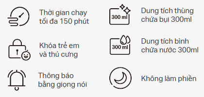 - Tự động sạc - Tự động quay về đế sạc khi pin yếu và quay trở lại vị trí dừng trước đó.
