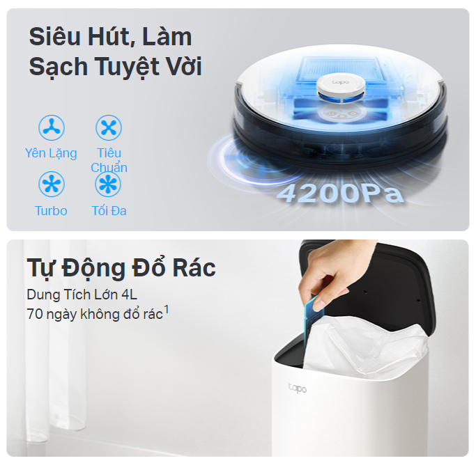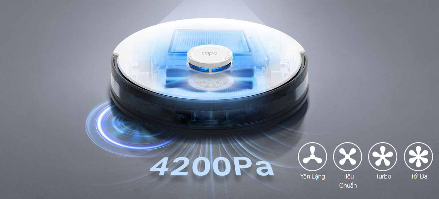 Với lực hút dẫn đầu ngành lên đến 4200Pa, Robot hút bụi Tapo được thiết kế để làm sạch sâu hơn, quét sạch các mảnh vụn nằm giữa các khoảng trống và bụi ẩn trong thảm, không để lại gì ngoài sàn nhà không tì vết.