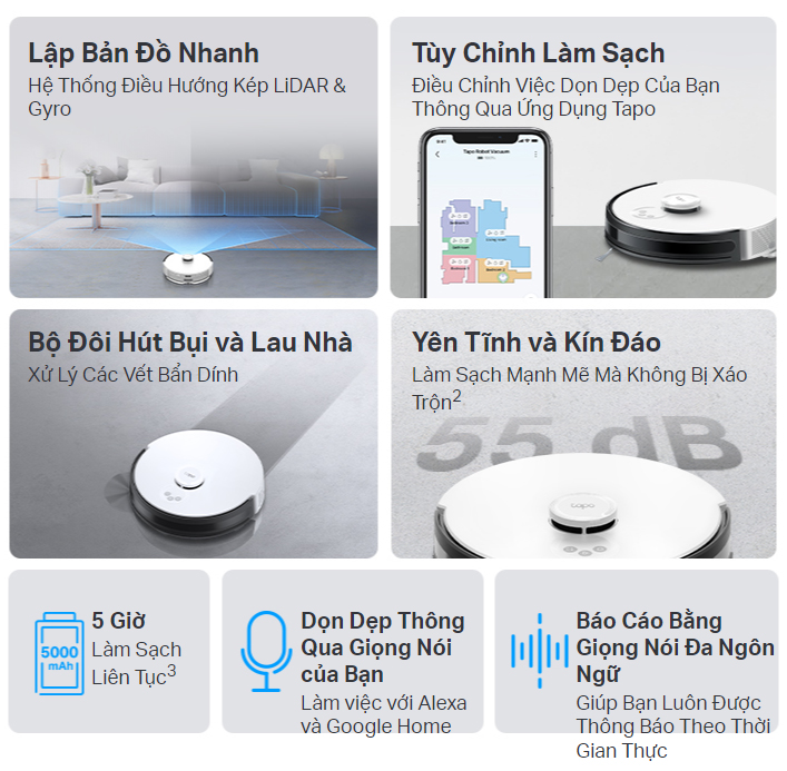 Tính năng khử tiếng ồn gấp ba lần giúp giảm mức tiếng ồn xuống còn 55 dB khi đang sử dụng—yên tĩnh hơn lò vi sóng đang chạy. Tapo dọn dẹp nhà cửa mà không làm phiền bạn hoặc thú cưng của bạn