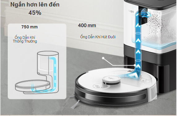 Với ống dẫn khí hút ở đuôi ngắn hơn gần 45% so với ống hút đáy thông thường và lực hút siêu mạnh 27000Pa, dock sẽ rỗng trong giây lát, không để lại cặn trong thùng hoặc trên sàn.