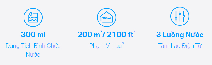 Hút bụi sẽ hút hết bụi trôi nổi và lau chùi các vết bẩn dính. Lau nhà là điều cần thiết cho những ngôi nhà có sàn cứng cần được đánh bóng thường xuyên. Với máy bơm điện tử, RV30 Plus cung cấp 3 luồng nước phù hợp với các loại sàn khác nhau với áp lực nước ổn định và ổn định.