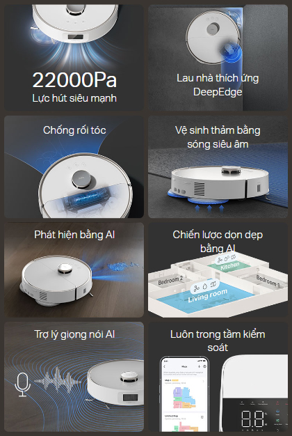 - Chiến lược dọn dẹp bằng AI - Nhận diện thông minh bố cục phòng và đặc điểm đồ nội thất để tùy chỉnh giải pháp dọn dẹp.