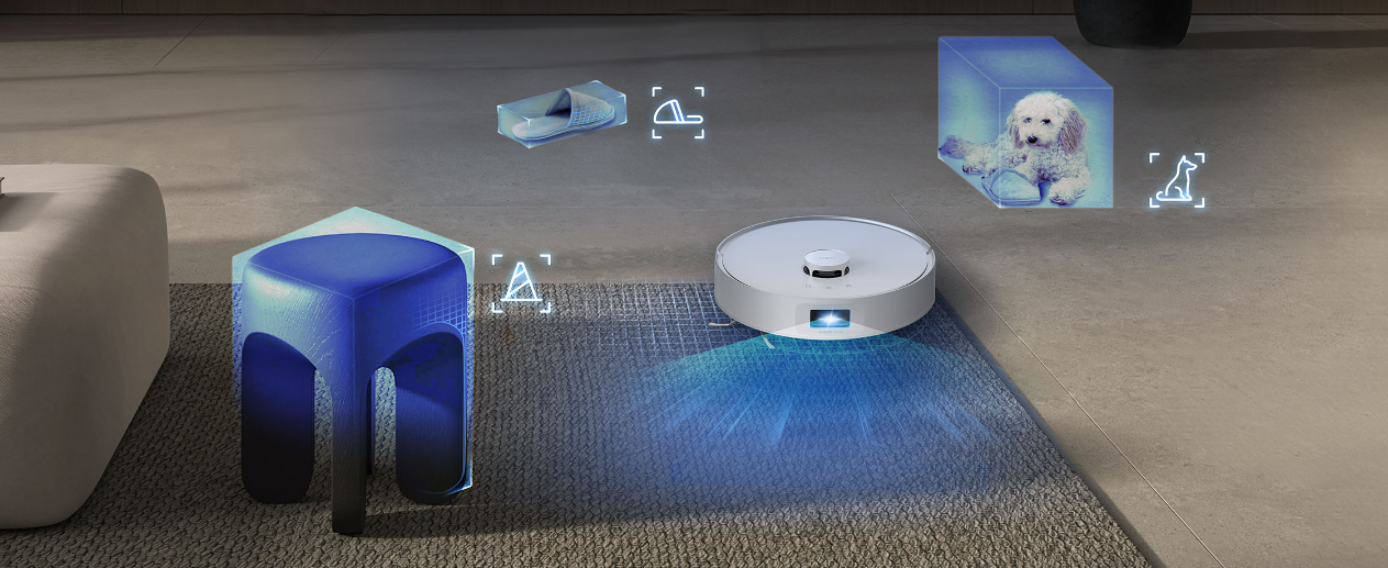 Với camera RGB, đèn cấu trúc 3D và các thuật toán AI, robot nhận biết và tránh các vật dụng như dây cáp, dép, đồ chơi của thú cưng, đảm bảo việc dọn dẹp hiệu quả.