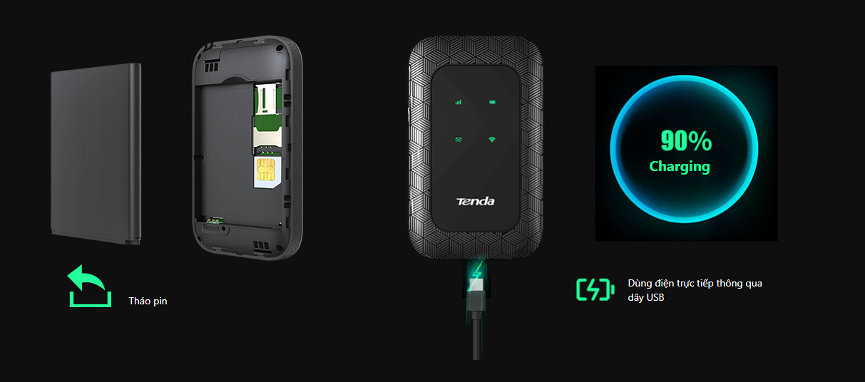 Trang bị viên pin dung lượng cao đến 2100 mAh, Tenda 4G180 có thể hoạt động liên tục đến 10 tiếng, và có thể cấp nguồn thông qua cổng USB