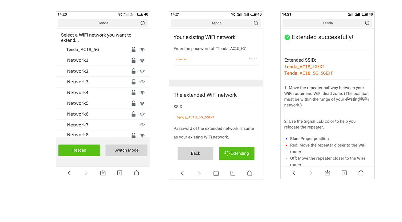 Lần theo màu sắc của đèn tín hiệu LED, bạn có thể dễ dàng tìm được vị trí tốt nhất cho bộ lặp sóng của mình theo môi trường mạng thực tế của bạn. Màu xanh cho biết kết nối tốt, và màu đỏ cho biết kết nối yếu.