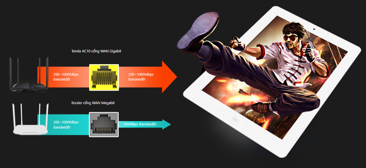 AC10 là Router WiFi hiệu suất cao, được thiết kế với đầy đủ cổng WAN và LAN Gigabit, loại bỏ nút thắt về tốc độ cổng có dây khi làm việc với băng thông nhanh hơn của cáp quang.