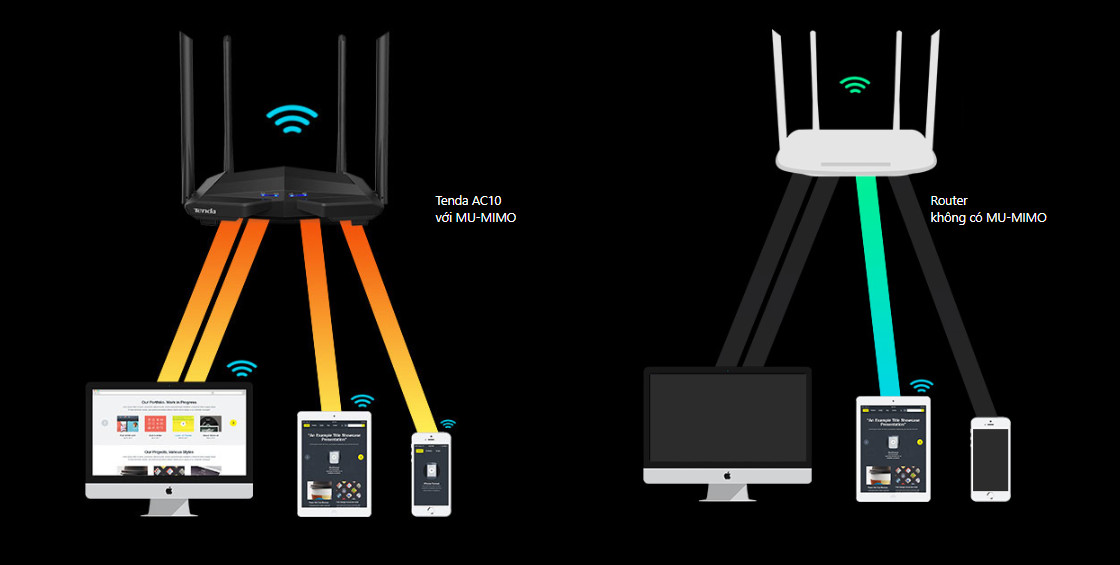 Với công nghệ MU-MIMO cải tiến, bước đột phá của chuẩn 802.11 ac thế hệ mới, AC10 có thể truyền tải nhiều luồng tín hiệu đến nhiều thiết bị cùng một lúc, giảm độ trễ và cải thiện số lượng thiết bị được kết nối.