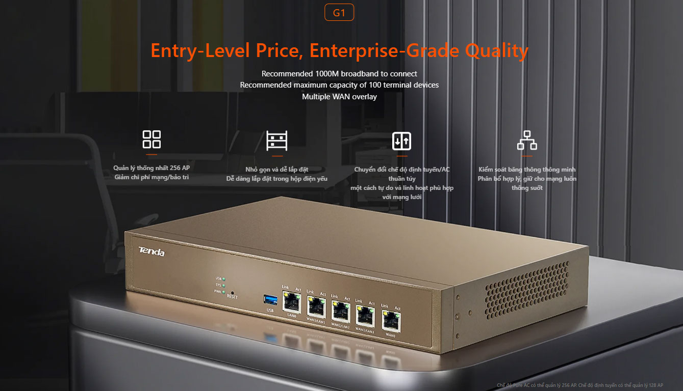 G1 là bộ định tuyến cấp doanh nghiệp được Tenda thiết kế riêng cho các doanh nghiệp vừa và nhỏ. Thiết bị cung cấp quản lý hành vi tích hợp và quản lý băng thông thông minh.