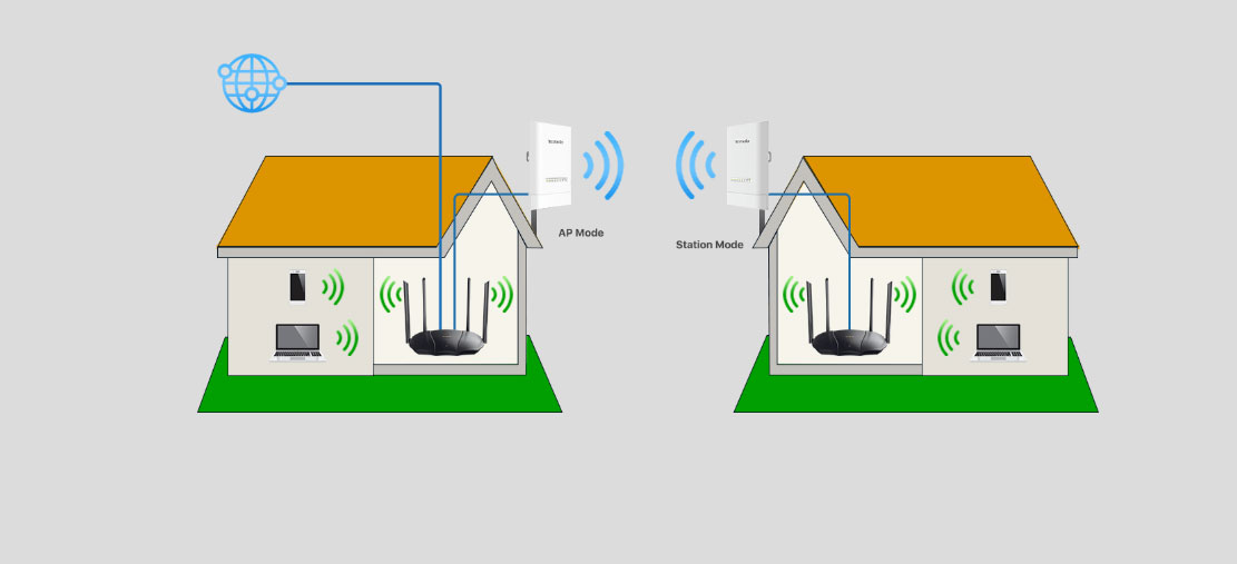 Một chế độ hoạt động ở chế độ AP và chế độ còn lại ở chế độ Trạm để tạo kết nối không dây tầm xa nhằm chia sẻ internet giữa các tòa nhà hoặc hàng xóm.