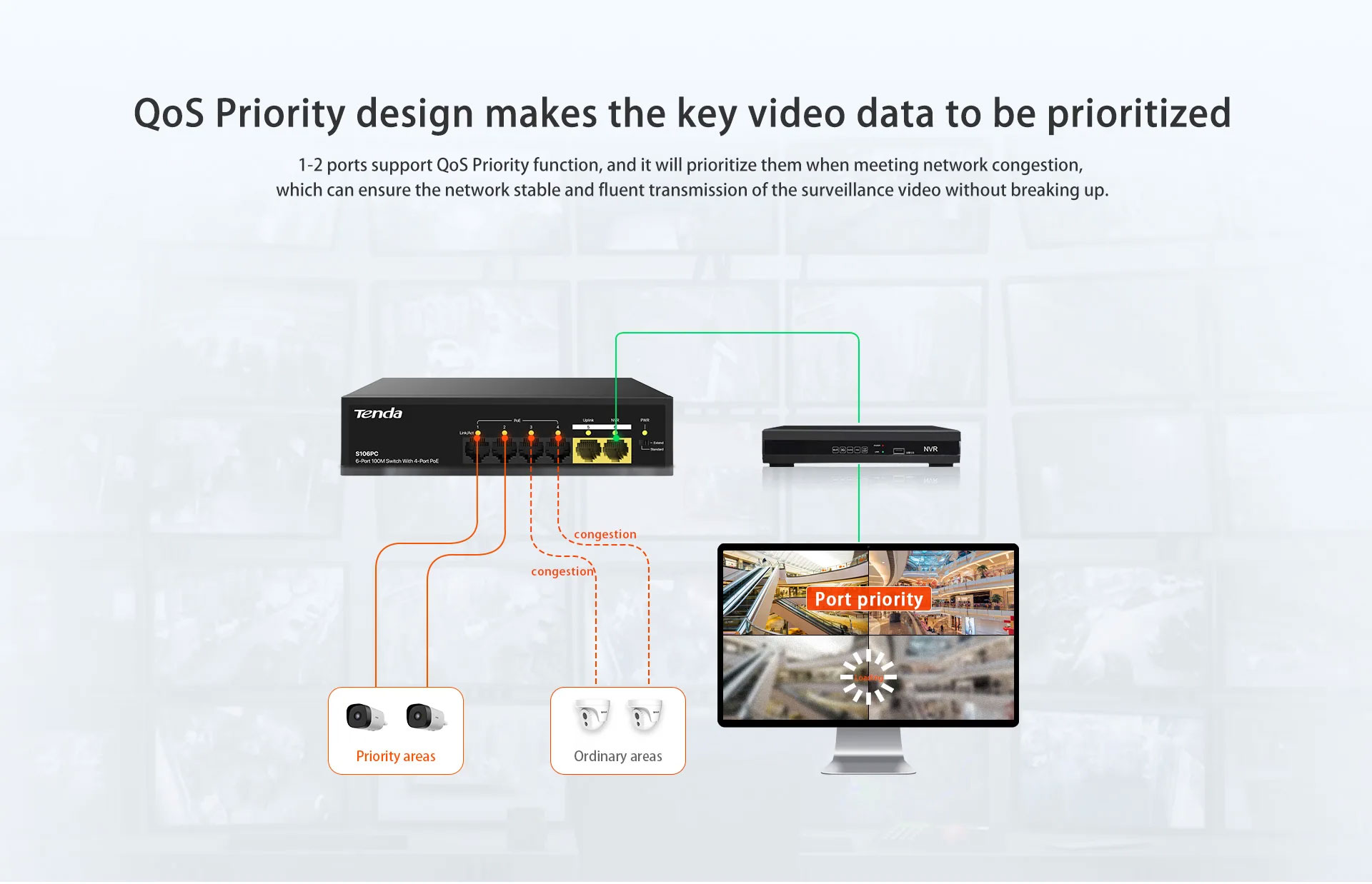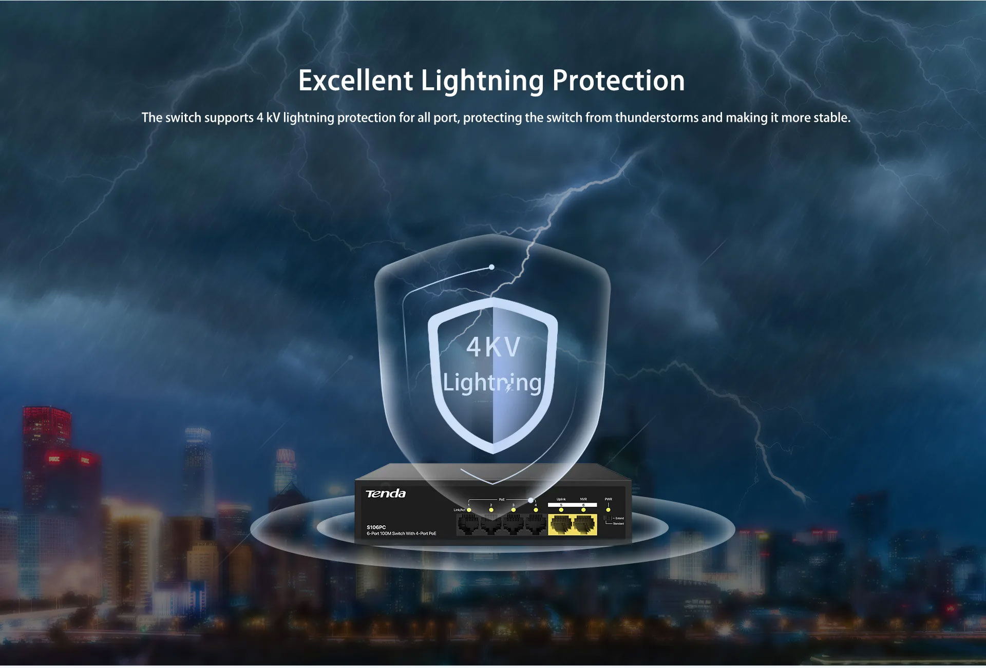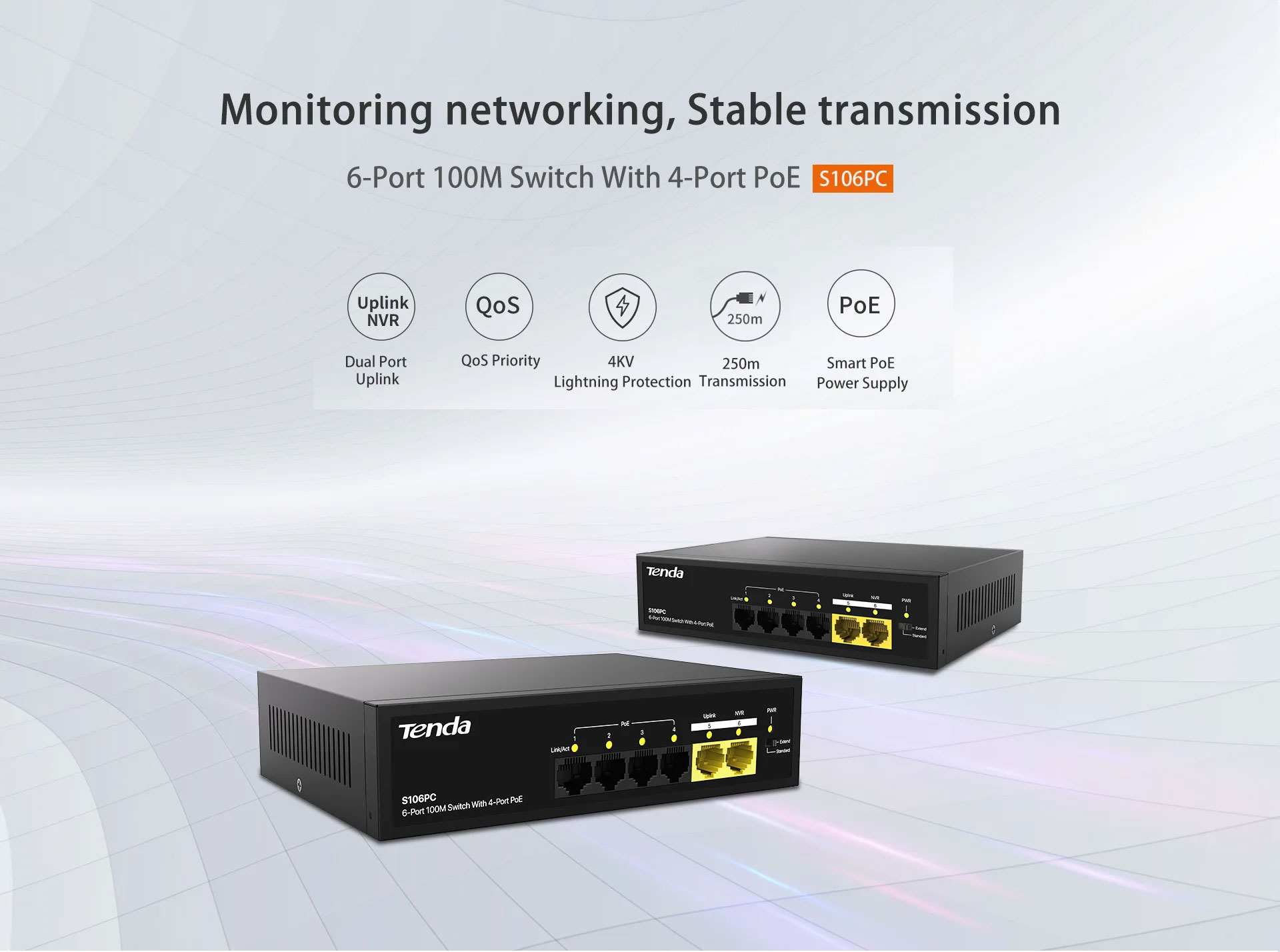 S106PC là một bộ chuyển mạch PoE uplink không được quản lý 100M cổng kép được thiết kế độc lập bởi Tenda. Tương thích với chế độ cung cấp điện PoE tiêu chuẩn AF/AT, nhận dạng thông minh các thiết bị được cấp nguồn.