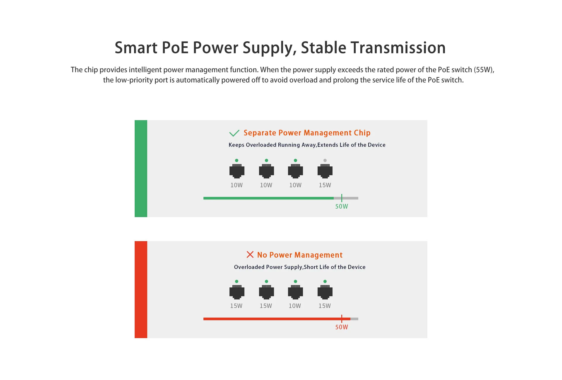 Công suất đầu ra tối đa của một cổng đơn là 30W và của toàn bộ máy là 55W. Hỗ trợ mở rộng mạng 250m, ưu tiên QoS và các chức năng khác, được thiết kế cho ngoài trời, trong nhà, v.v.