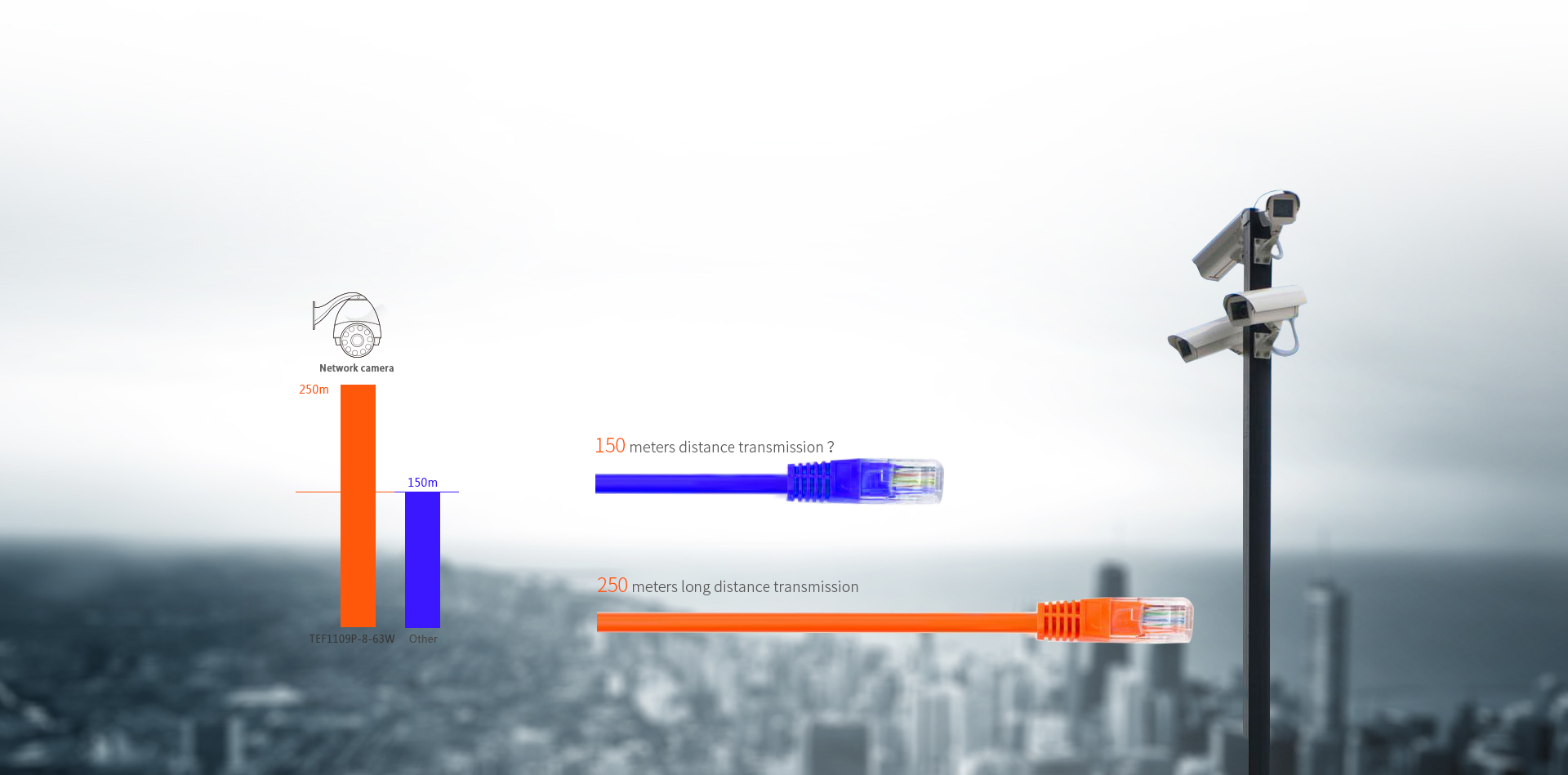 Do môi trường giám sát phức tạp, khi làm cáp và kết nối mạng, rất thường gặp phải vấn đề về khoảng cách truyền dẫn mạng không đầy đủ, khoảng cách của mỗi camera thiết bị đầu cuối đến trung tâm giám sát khác nhau, một số chỉ vài mét cho đến vài trăm mét, thậm chí xa hơn cả cây số. Tenda Switch PoE TEF11 giám sát, độc quyền sáng chế công nghệ mở rộng mạng, sử dụng cặp xoắn phổ biến hiện có, có thể hỗ trợ truyền dữ liệu 250 mét, phá vỡ giới hạn truyền dẫn hiện tại hàng trăm mét.
