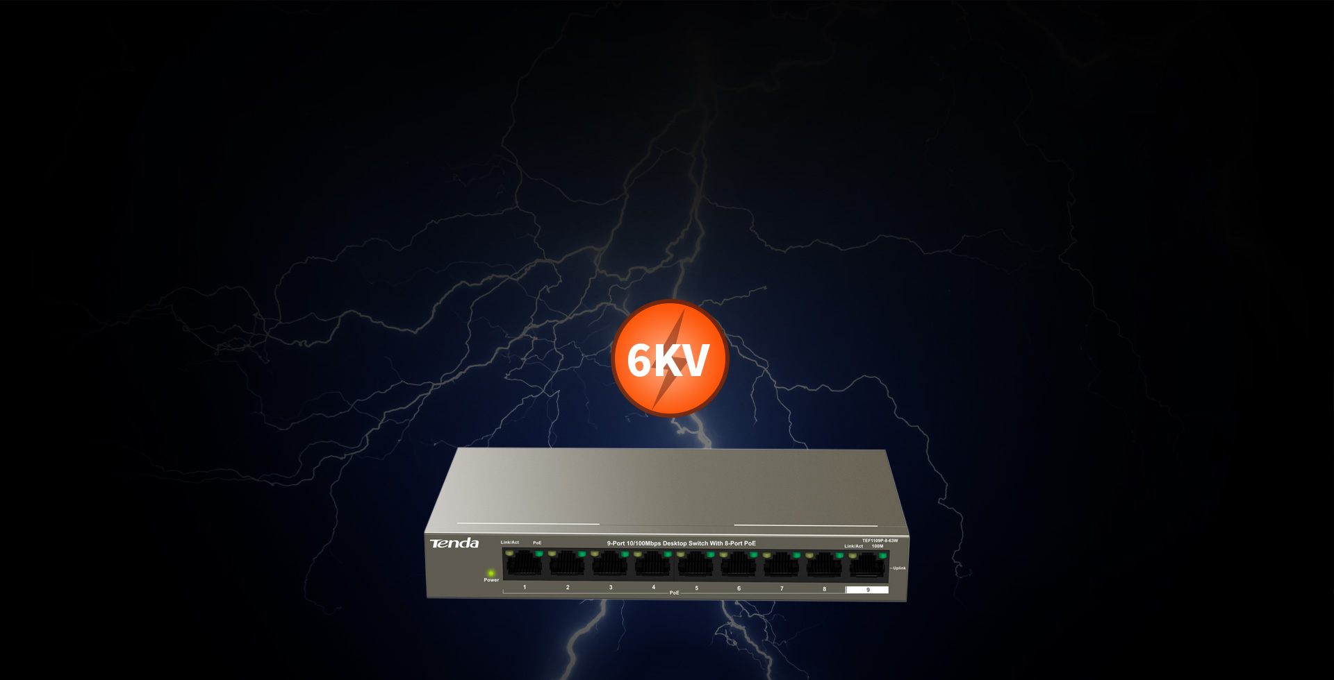 Trong dự án thực tế, camera IP hoặc AP thường được lắp đặt ngoài trời hoặc vị trí cao, điều này làm tăng nguy cơ camera và switch PoE bị tác động do sét. Kết quả là thiết bị cá nhân bị hỏng hoặc toàn bộ hệ thống mạng (LAN) địa phương bị tê liệt. Switch Tenda TEF11 có thiết kế chống sét chuyên nghiệp - lên đến 6kv bảo vệ cổng, với thiết kế hai cấp độ bảo vệ tương ứng, hạn chế sức ảnh hưởng của sét từ cáp, cung cấp cho toàn bộ hệ thống mạng lưới giám sát hàng rào an toàn. Tiêu chuẩn kiểm tra cao hơn nhiều so với yêu cầu CE quốc gia. Trong thời tiết giông bão, nó có thể cung cấp hệ thống giám sát hoặc mạng cục bộ ổn định, dịch vụ tin cậy, bảo vệ việc truyền dẫn hình ảnh bình thường.