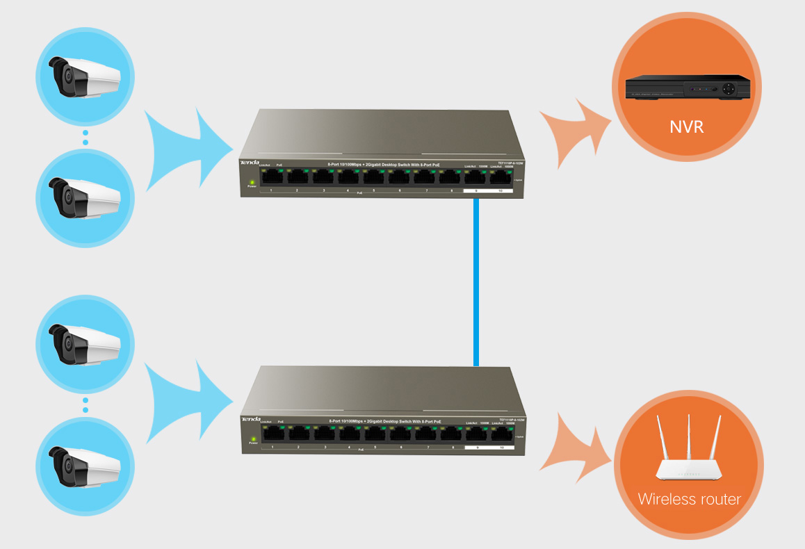 Cổng 1-8 hỗ trợ chuẩn IEEE 802.3at và IEEE 802.3af PoE. Nó cung cấp công suất PoE lên tới 30W mỗi cổng và lên tới 99W cho toàn bộ thiết bị. Hai cổng đường lên gigabit có khả năng kết nối theo tầng của nhiều thiết bị hơn.