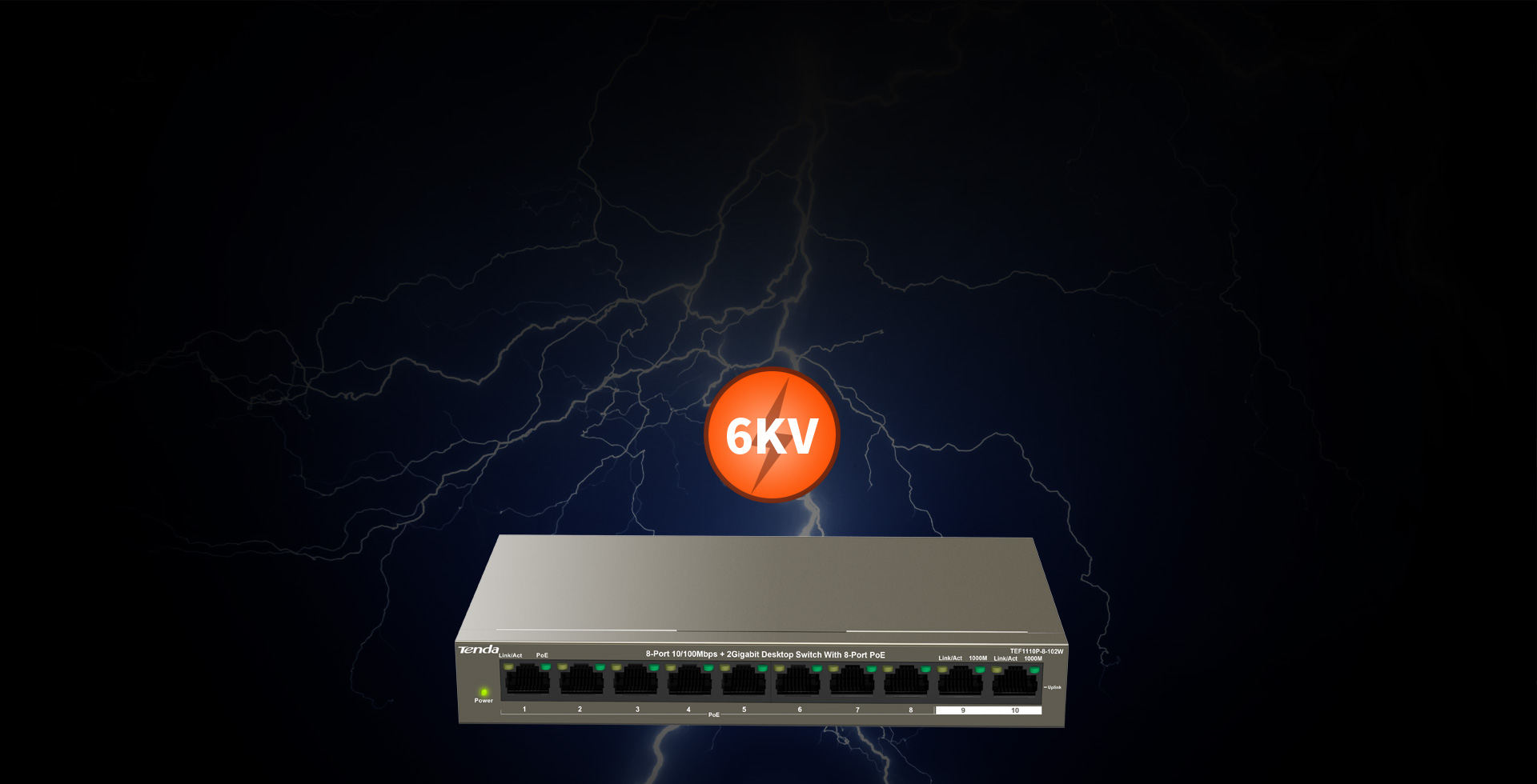 Trong dự án giám sát thực tế, camera thường được lắp đặt ngoài trời hoặc vị trí cao hơn, điều này cũng làm tăng khả năng bị sét đánh của camera và switch PoE. Kết quả là từng thiết bị riêng lẻ bị hỏng hoặc dẫn đến tê liệt toàn bộ mạng cục bộ (LAN) Các thiết bị chuyển mạch dòng .Tenda TEF11 có thiết kế chống sét chuyên nghiệp - cổng 6 kv và ngăn chặn sấm sét cung cấp điện, với hai cấp độ thiết kế bảo vệ tương ứng, hạn chế hiệu quả sức mạnh của sét từ cáp, tương đương với việc cung cấp bảo mật cho toàn bộ hệ thống giám sát mạng hàng rào, Tiêu chuẩn kiểm tra cao hơn nhiều so với yêu cầu CE quốc gia. Trong thời tiết giông bão, nó cũng có thể cung cấp dịch vụ ổn định, đáng tin cậy cho mạng giám sát, bảo vệ việc truyền hình ảnh được bình thường.