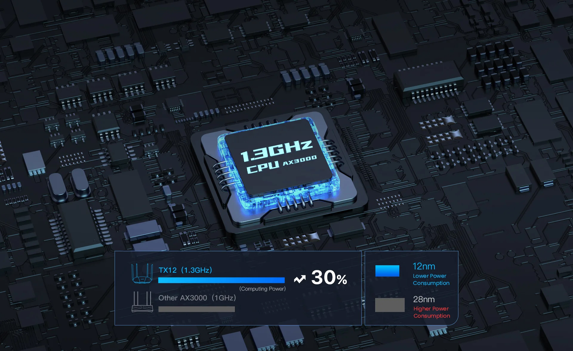 TX12 được trang bị CPU lõi kép 1,3 GHz, sử dụng quy trình 12nm tiên tiến. Sức mạnh tính toán toàn diện của nó cao hơn 30% so với bộ định tuyến lõi kép AX3000 cũ. Điều này làm cho bộ định tuyến tiêu thụ ít điện năng hơn và tỏa ra ít nhiệt hơn, và sức mạnh của nó đảm bảo mạng ổn định và mượt mà.