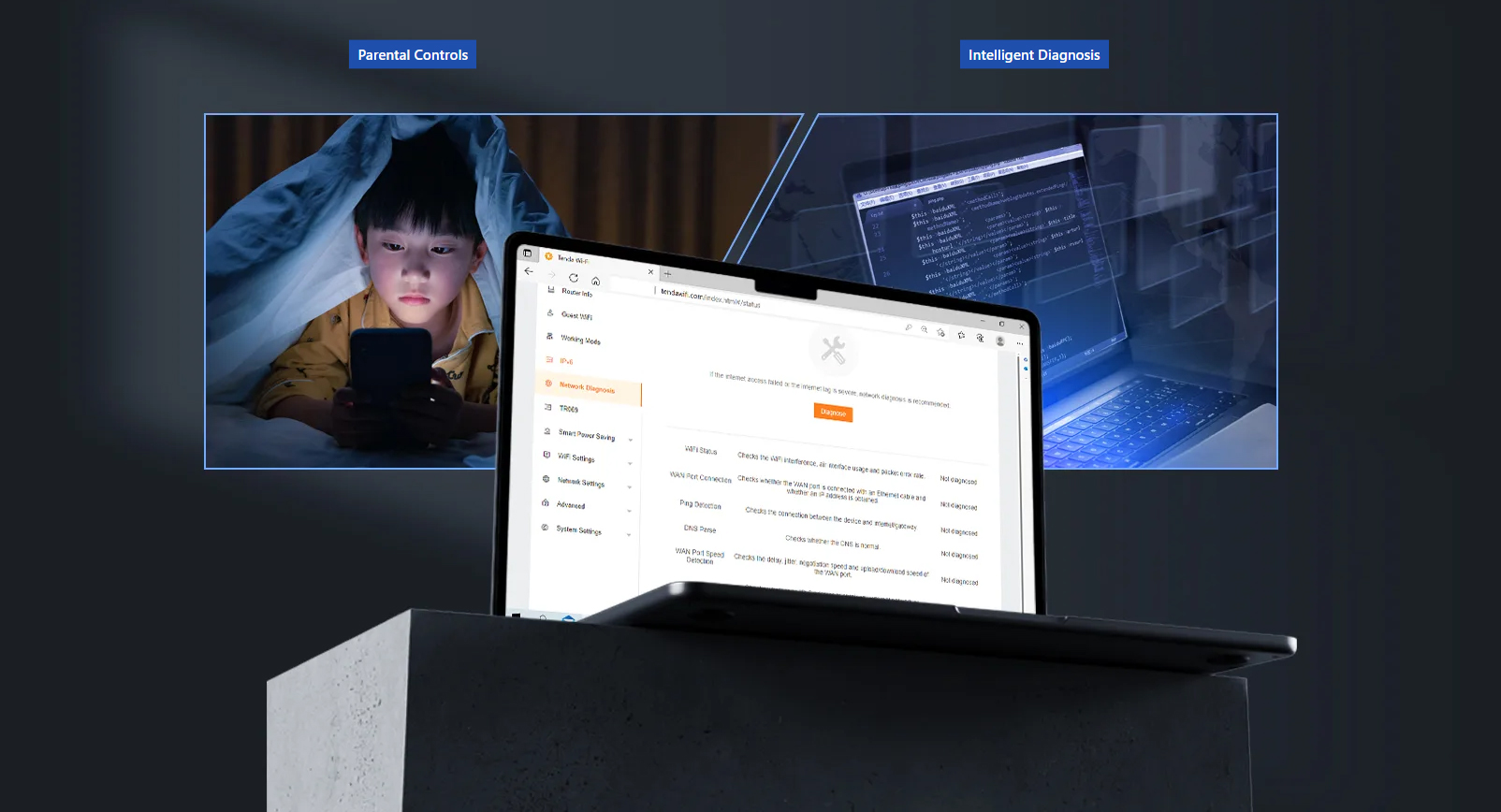 Sử dụng Tenda WiFi APP hoặc trang quản lý Web, bạn có thể ngay lập tức có nhiều chức năng thực tế: Kiểm soát truy cập internet của trẻ em, ngăn ngừa nghiện mạng. Tự kiểm tra nhanh chẩn đoán thông minh, thực hiện sửa chữa mạng. Nhiều tính năng khác sẽ sớm ra mắt. Hãy theo dõi!