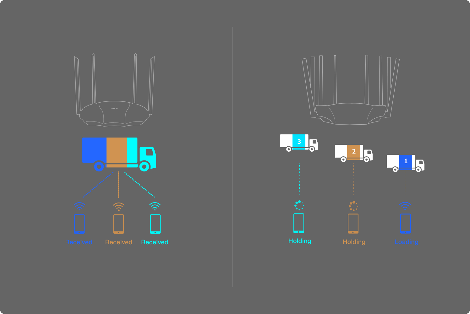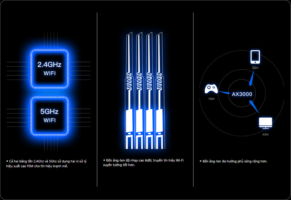 Trang bị 4 bộ khuyếch đại công suất riêng biệt FEM, cùng với 4 anten độ nhạy thu 6dBi mang lại vùng phủ sóng WiFi rộng khắp khôi nhà của bạn.