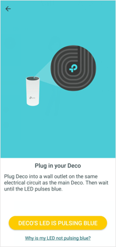 4. Bật nguồn thiết bị Deco mới và đợi đèn LED chuyển sang màu xanh lam nhấp nháy, sau đó nhấn vào “Đèn LED Deco đang xanh lam nhấp nháy”.