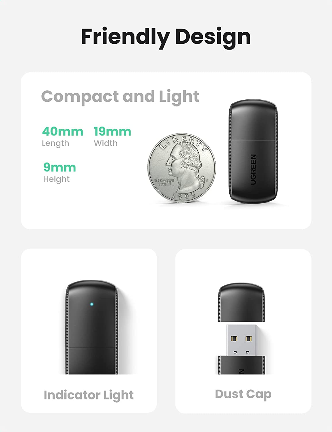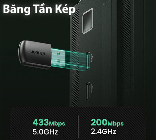Thiết bị USB nhận Bluetooth công suất Bluetooth 20mW, màu đen Ugreen 20204 hỗ trợ 2 băn tần cùng lúc 5G và 2.4G cùng lúc có thể tự động chuyển đổi trong các tình huống khác nhau. Để hệ thống mạng luôn nhanh và ổn định. Hỗ trợ tốc độ mạng cao lến đến 433Mbps ở băng tần 5G và 200Mbps ở băng tần 2.4G phù hợp và đáp ứng cho các nhu cầu giải trí của bạn.