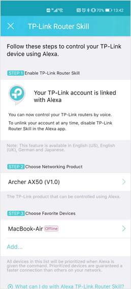Với Skill TP-Link Router, bạn có thể ưu tiên các thiết bị cá nhân yêu thích của mình trong một thời gian nhất định. Ví dụ: bạn có thể nói “Alexa, yêu cầu TP-Link ưu tiên các thiết bị yêu thích của tôi trong 2 giờ.”