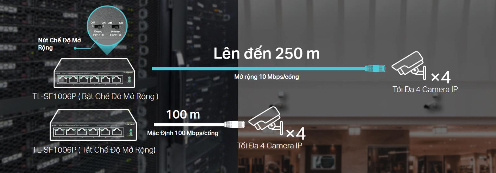 Với chế độ mở rộng sóng, khoảng cách truyền PoE lên tới 250 m—hoàn hảo cho việc triển khai Camera IP ở những khu vực rộng lớn.
