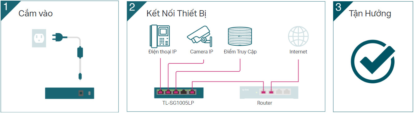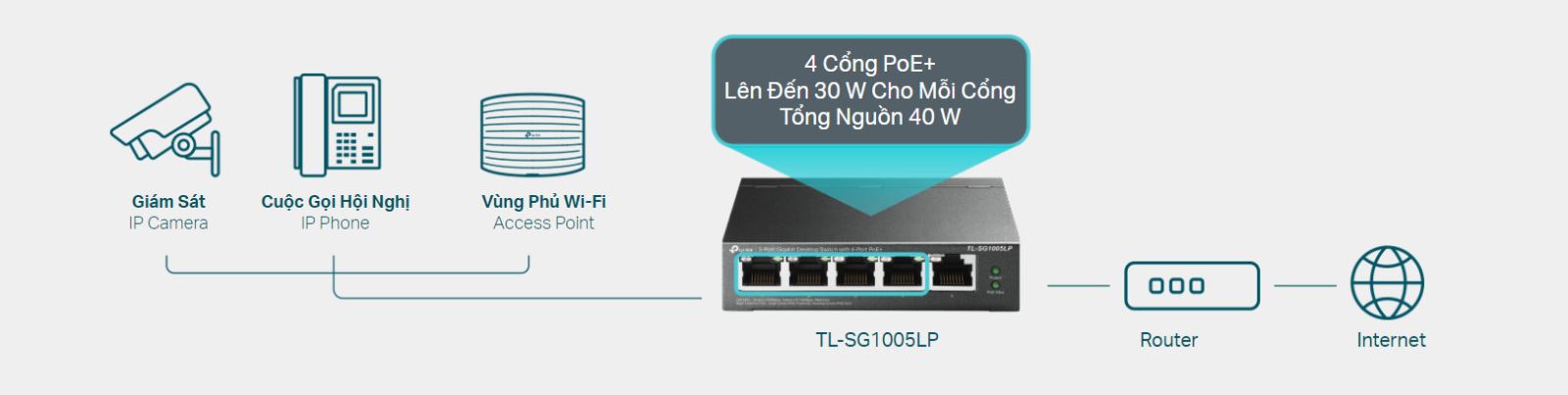 Với 4 cổng PoE, chuyển dữ liệu và cấp nguồn chỉ trên một cáp