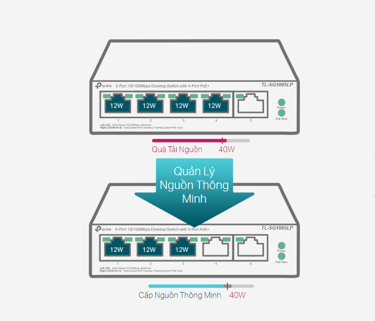 Khi tổng công suất tiêu thụ vượt quá 40 W, quản lý nguồn thông minh sẽ cắt công suất cổng ưu tiên thấp hơn. Điều này đảm bảo nguồn điện của cổng có mức ưu tiên cao và bảo vệ thiết bị khỏi tình trạng quá tải điện. Nó cũng tự động phát hiện và cung cấp năng lượng cần thiết cho các thiết bị PoE của bạn đồng thời bảo vệ thiết bị PoE và không PoE của bạn giúp tránh hư hỏng..