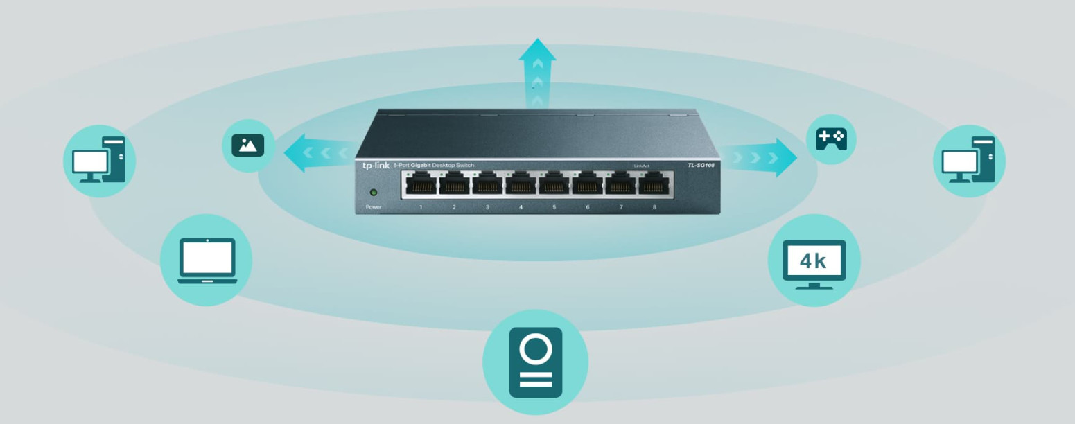Switch để bàn TL-SG108 giúp tăng tốc độ kết nối trung tâm và máy chủ mạng của bạn. Bất kể bạn ở nhà hay ở văn phòng, TL-SG108 giúp bạn xử lý công việc nhanh chóng và dễ dàng bất cứ lúc nào.